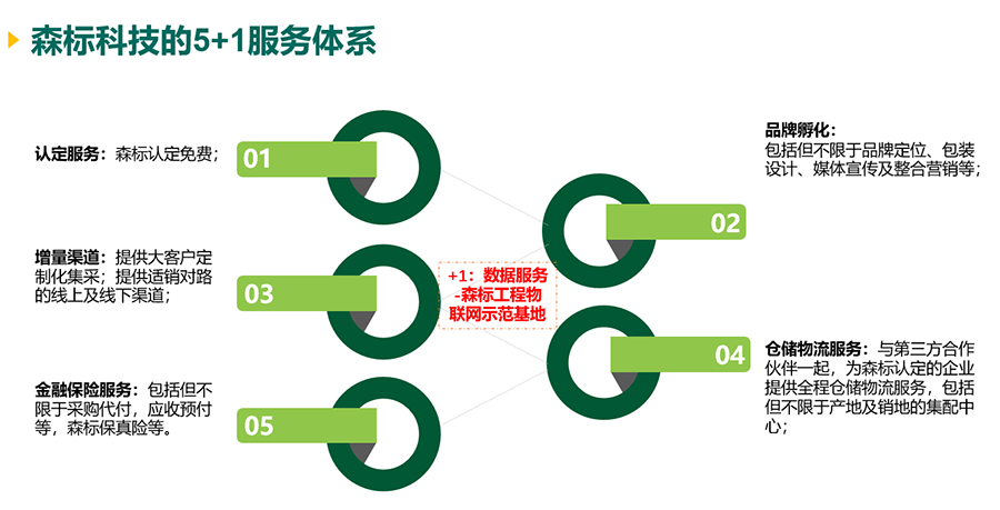 森林生态标志产品建设工程是推进绿色发展、生产“四无”产品的国家工程,严格执行高标准认定,检测指标涉及千余项,以保障认定出的产品无农药残留、无抗生素、无激素、无重金属污染;而通过采用区块链、物联网、智能控制等先进技术,对森林生态标志产品实行一物一码,全程追溯,以保障森林生态标志产品来源可溯、质量可控、责任可究。其打造的“5+1服务体系”是基于森标产品认定延伸而来,通过提供认定服务、电商(品牌)孵化服务、增量渠道服务、仓储物流服务、供应链金融服务及物联网示范基地建设等服务内容,应用信息技术赋能林业产业,为各类林业生产、经营主体提供多样服务,帮助解决产品品牌建设、线上线下销售渠道建设、流动资金、仓储物流、市场数据分析等相关问题,助力参与森标工程的各类林业生产、经营主体提高市场竞争力。